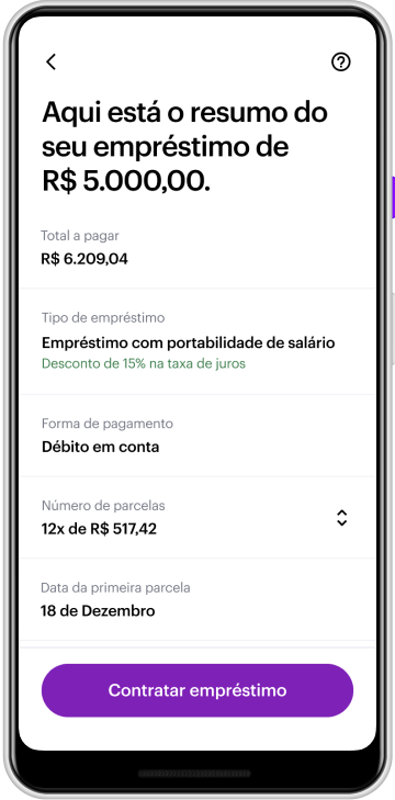 Automatically receive the money into your Nubank account and easily manage your payment plans once the loan is confirmed. All in a simple and efficient way.